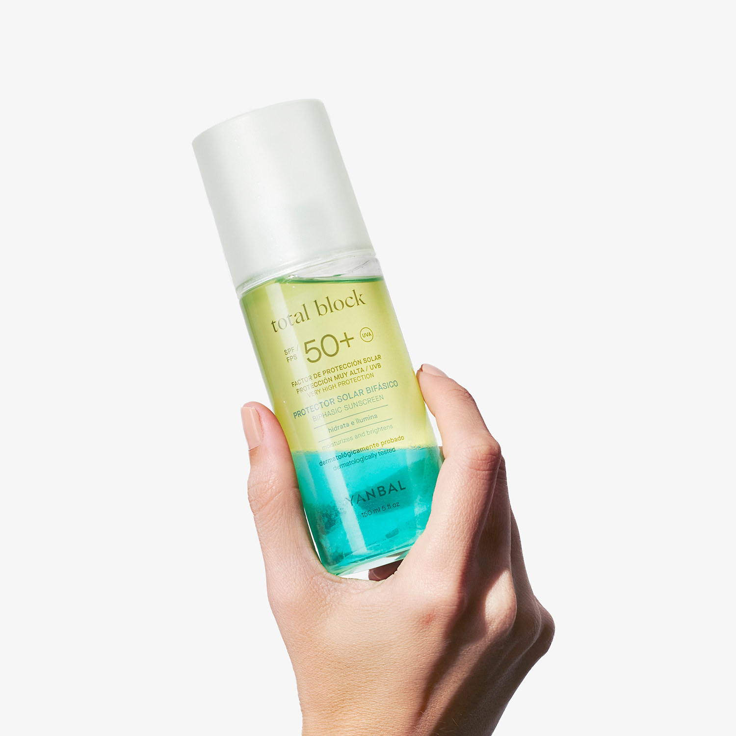 Un Total Block con fórmula bifásica en spray que protege contra rayos UVB y UVA, con SPF 50+ y PA++++; al mismo tiempo que hidrata y deja tu piel con un acabado luminoso perfecto. Con su textura ligera y ultra fresca no sentirás tu piel pesada ni grasosa.