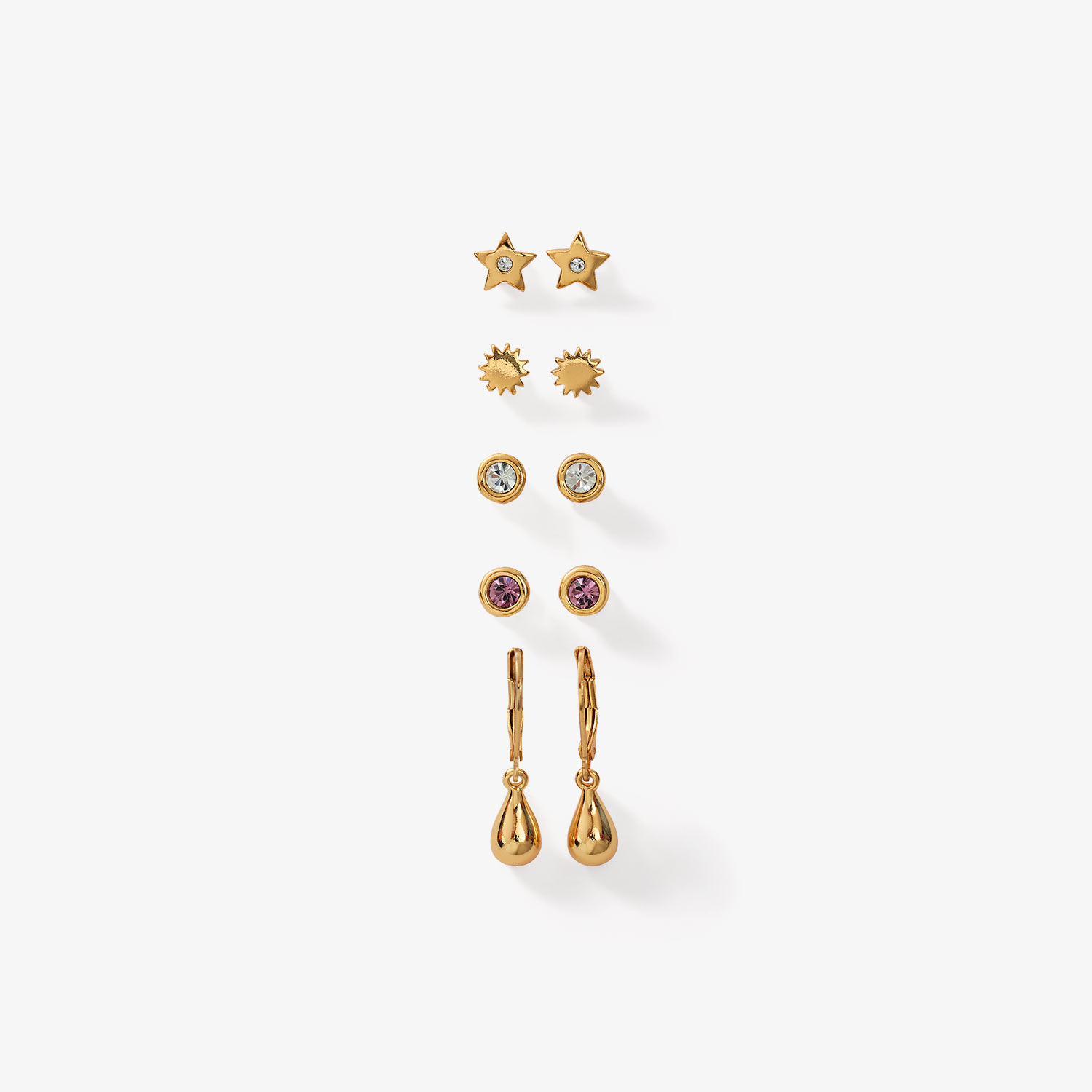 Baño de oro amarillo brillante de 24 quilates con finos cristales en traslúcido y lila. Baño de oro amarillo brillante de 24 quilates con finos cristales en traslúcido y lila.